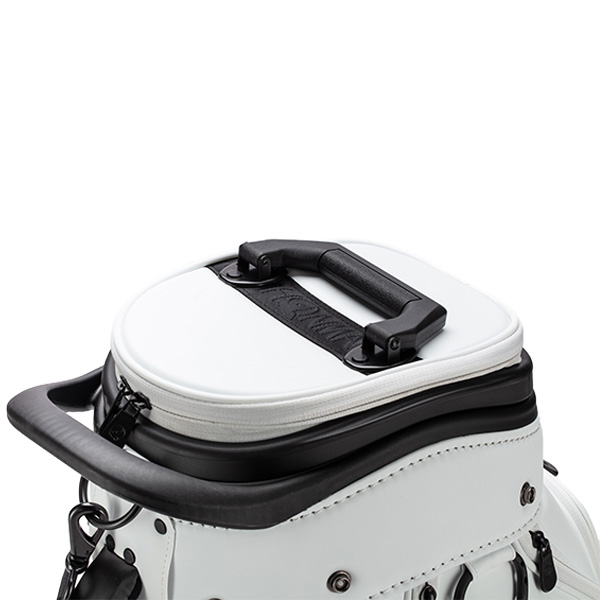 輸送時にクラブを傷から守る、上下に伸縮可能な筒状カバーを備えたキャディバッグ。クラブをしっかりと包み込み、持ち運び時の衝撃を軽減します。 ※筒状カバーを伸ばした状態では、収納可能なクラブ本数は約12本です。 安定感に優れ、操作性も高いストッパー付き4輪タイヤ仕様を採用。移動時の取り回しや、停車時の安定性にも配慮したモデルです。 カラーWHITE、BLACK サイズ9.0インチ 重量7.15㎏ 素材合成皮革(P.U) 品番CB12615 生産国中国 機能クラブを傷つけない筒状のカバー。4輪タイヤ、シューズインポケット、グローブホルダー