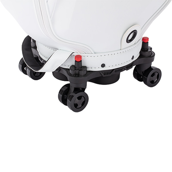 輸送時にクラブを傷から守る、上下に伸縮可能な筒状カバーを備えたキャディバッグ。クラブをしっかりと包み込み、持ち運び時の衝撃を軽減します。 ※筒状カバーを伸ばした状態では、収納可能なクラブ本数は約12本です。 安定感に優れ、操作性も高いストッパー付き4輪タイヤ仕様を採用。移動時の取り回しや、停車時の安定性にも配慮したモデルです。