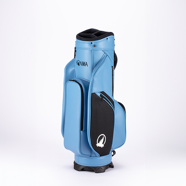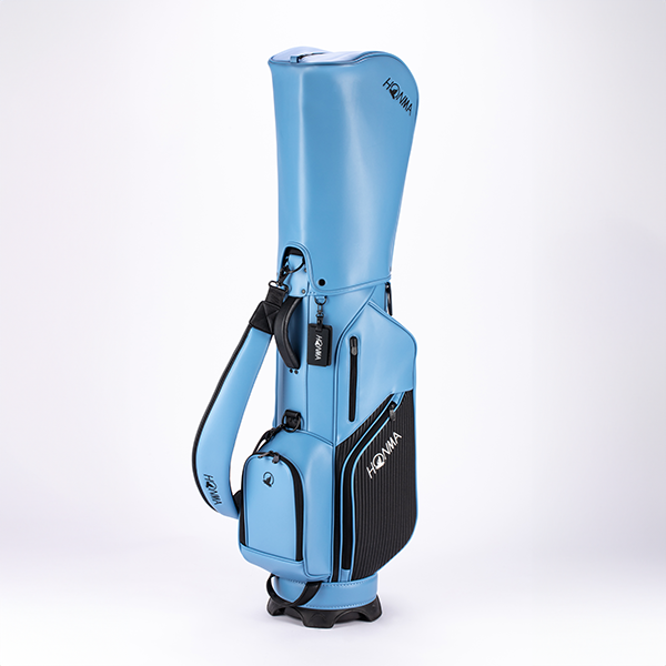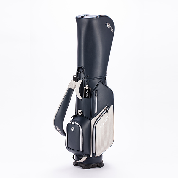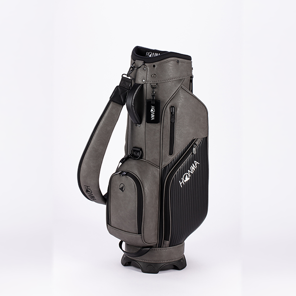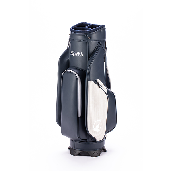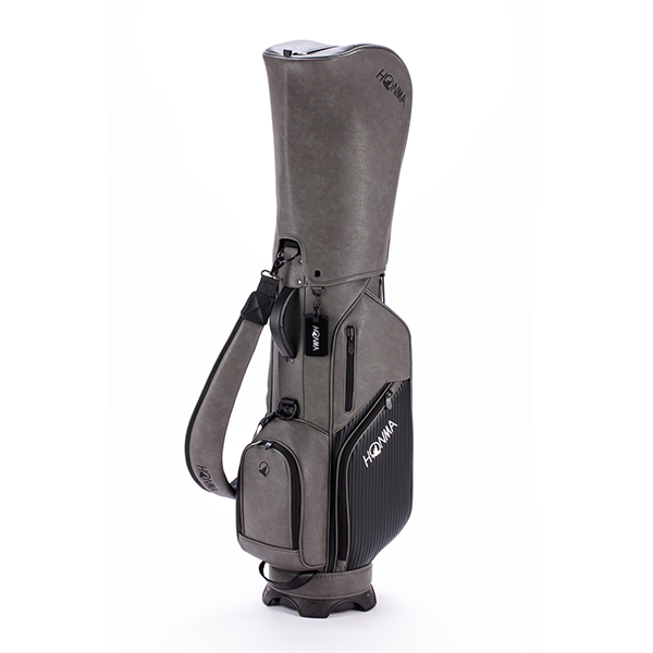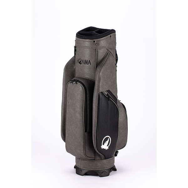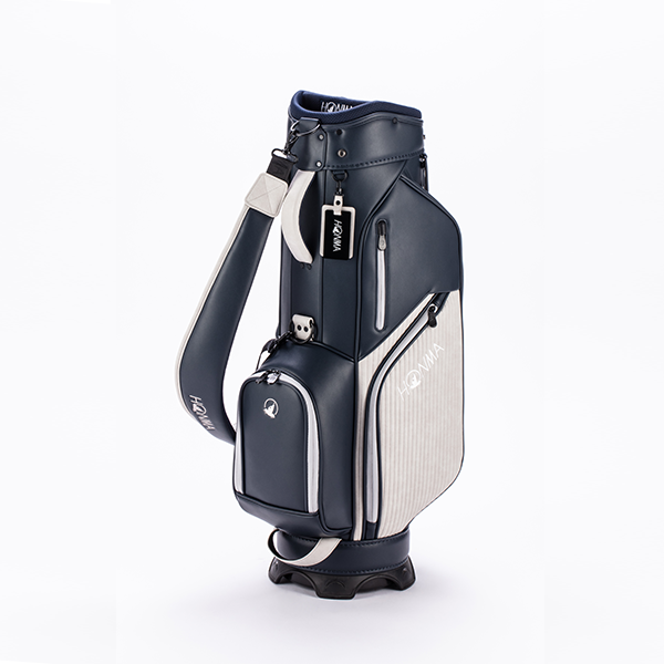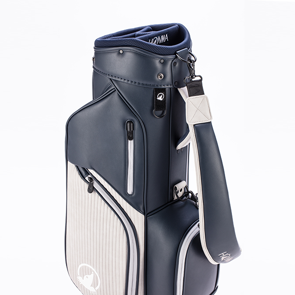 上品な「シボ感」のあるPUレザーをベースに、エッジの効いた「ボーダー調」の素材をアクセントに加えたツートンカラーのカート式キャディバッグです。整理整頓が捗る豊富なポケットを完備。肩に吸い付くカーブショルダーで移動もラクラクです。