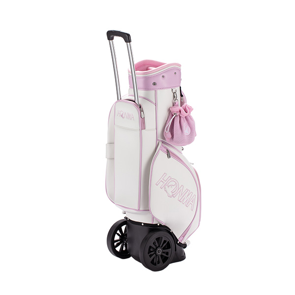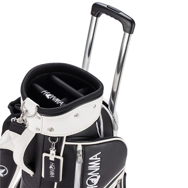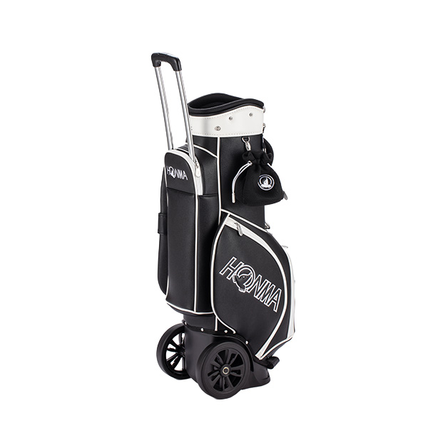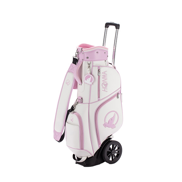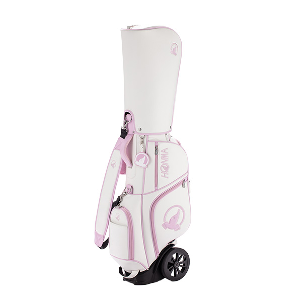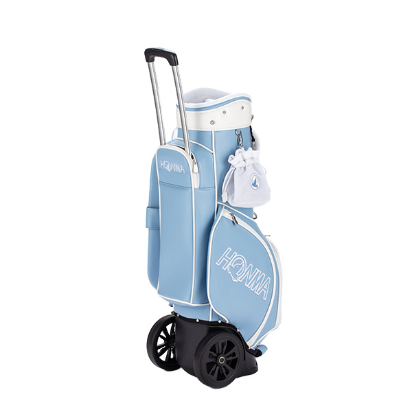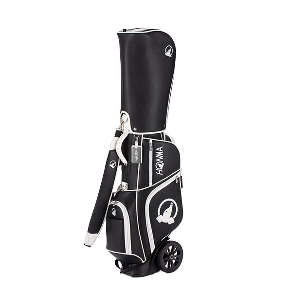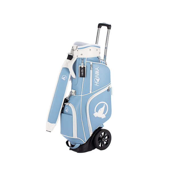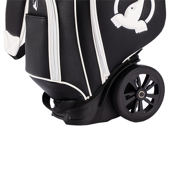 シボ感のあるPUレザーを贅沢に使用しながら、あえて「巾着タイプ」のポーチを付属させることで、こなれたカジュアルテイストのキャディバック。クラシックな品格と現代的なトレンドが同居するデザインです。背面には収納式バーと大型2輪タイヤを完備し、重さを感じさせないスムーズな操作性を実現。見た目の余裕と、移動の快適さを両立させたキャディバックです。