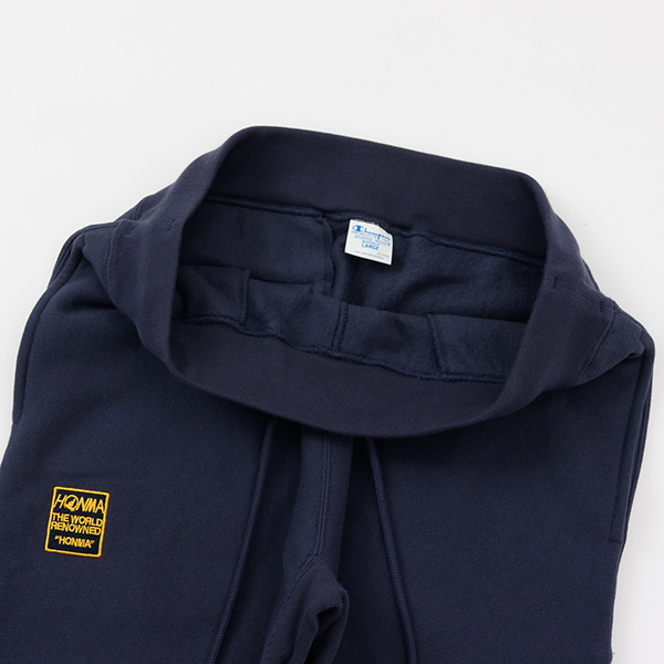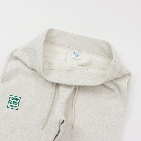 「HONMA」が以前掲げていたタグライン「THE WORLD REKNOWNED “HONMA”」をフィーチャーし、世界に名を馳せたブランドの誇りを、現代的なスタイルで再構築したアイテムです。Champion®(チャンピオン)のスウェットシャツは、「ザ キング オブ スウェットシャツ」と評されるほど、世界中の多くのファンに愛されてきました。チャンピオンを代表する製法の「REVERSE WEAVE®(リバースウィーブ®)」。洗うほどにタフになり、着こむほどに独特の風合いや味が出る裏起毛素材を使用した「REVERSE WEAVE® 11.5oz. Terry Fleece(リバースウィーブ® 11.5オンス テリーフリース)」シリーズのスウェットパンツです。コットン素材は環境に配慮して生産されたサステナブルなコットンを100%使用。本来は縦方向に使われる生地を横方向に使用する「REVERSE WEAVE®」製法によって縦の生地の縮みを防ぐと同時に、股下部分にガゼットリブを付けることで動きやすさに配慮しています。脇ポケットから下をシームレスにしているので、脱ぎ着がスムーズです。右腿に「HONMA」がグローバル展開時に掲げていたタグラインをモチーフにした刺繍をしています。